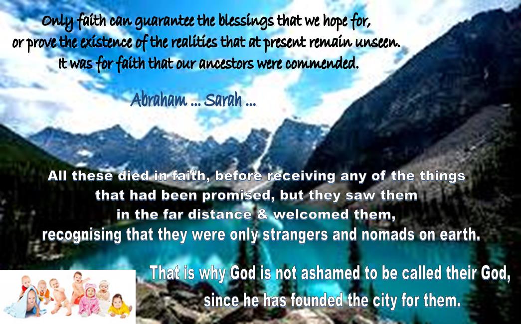 Extracted from the Sermon – Hebrews 11:1-2,8-19: Only faith can guarantee the blessings that we hope for, or prove the existence of the realities that at present remain unseen. It was for faith that our ancestors were commended. It was by faith that Abraham obeyed the call to set out for a country that was the inheritance given to him and his descendants, and that he set out without knowing where he was going. By faith he arrived, as a foreigner, in the Promised Land, and lived there as if in a strange country, with Isaac and Jacob, who were heirs with him of the same promise. They lived there in tents while he looked forward to a city founded, designed and built by God. It was equally by faith that Sarah, in spite of being past the age, was made able to conceive (Sarah conceived at the age of 89), because she believed that he who had made the promise would be faithful to it. Because of this, there came from one man, and one who was already as good as dead himself (referred to Abraham at the age of 100 years old), more descendants than could be counted, as many as the stars of heaven or the grains of sand on the seashore. All these died in faith, before receiving any of the things that had been promised, but they saw them in the far distance and welcomed them, recognising that they were only strangers and nomads on earth. People who use such terms about themselves make it quite plain that they are in search of their real homeland. They can hardly have meant the country they came from, since they had the opportunity to go back to it; but in fact they were longing for a better homeland, their heavenly homeland. That is why God is not ashamed to be called their God, since he has founded the city for them. It was by faith that Abraham, when put to the test, offered up Isaac (Isaac was the promised son given to Abraham when he was 100 and Sarah 90 years old). He offered to sacrifice his only son even though the promises had been made to him and he had been told: It is through Isaac that your name will be carried on. He was confident that God had the power even to raise the dead; and so, figuratively speaking, he was given back Isaac from the dead. |