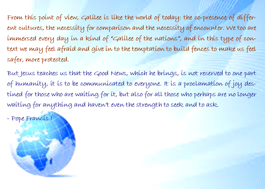 It is a borderland, a place of transit where people of different races, cultures, and religions converge. Thus Galilee becomes a symbolic place for the Gospel to open to all nations. From this point of view, Galilee is like the world of today: the co-presence of different cultures, the necessity for comparison and the necessity of encounter. We too are immersed every day in a kind of “Galilee of the nations”, and in this type of context we may feel afraid and give in to the temptation to build fences to make us feel safer, more protected. But Jesus teaches us that the Good News, which he brings, is not reserved to one part of humanity, it is to be communicated to everyone. It is a proclamation of joy destined for those who are waiting for it, but also for all those who perhaps are no longer waiting for anything and haven’t even the strength to seek and to ask. Starting from Galilee, Jesus teaches us that no one is excluded from the salvation of God, rather it is from the margins that God prefers to begin, from the least, so as to reach everyone. He teaches us a method, his method, which also expresses the content, which is the Father’s mercy. “Each Christian and every community must discern the path that the Lord points out, but all of us are asked to obey his call to go forth from our own comfort zone in order to reach all the ‘peripheries’ in need of the light of the Gospel” (Apostolic Exhortation, Evangelii Gaudium, n. 20).